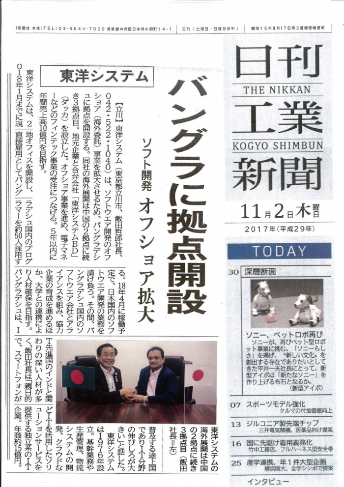バングラデシュに拠点開設の紹介記事が、2017年11月2日付の日刊工業新聞に掲載されました